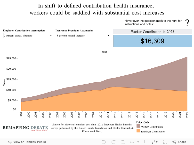 How much more will depend on two variables: the extent to which health insurance premiums increase over time and the decisions employers make to adjust their contributions. This visualization allows you to see how much of a gap the employee will have to fill under a variety of scenarios. Use the filters at the top to choose different annual rate changes in average health insurance premium cost and in employer contribution.